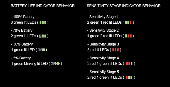 Последната част от горната част на мишката е индикатора в долният ляв ъгъл. Той има общо три черти който могат да светят в зелено или червено. Въпросният индикатор показва статуса на батерията и в коя от сензитивити зоните се намирате.