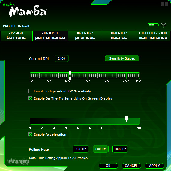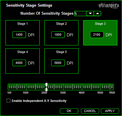 Първото което ще видите, е на колко dpi функционирате в момента и плъзгач който ще ви позволи да промените въпросното от 100 до феноменалните 5600 dpi. Има два начина посредством който да сменяте dpi-то докато работите (и без да влизате в софта). Стандартният метод е посредством „Sensitivity stages“: