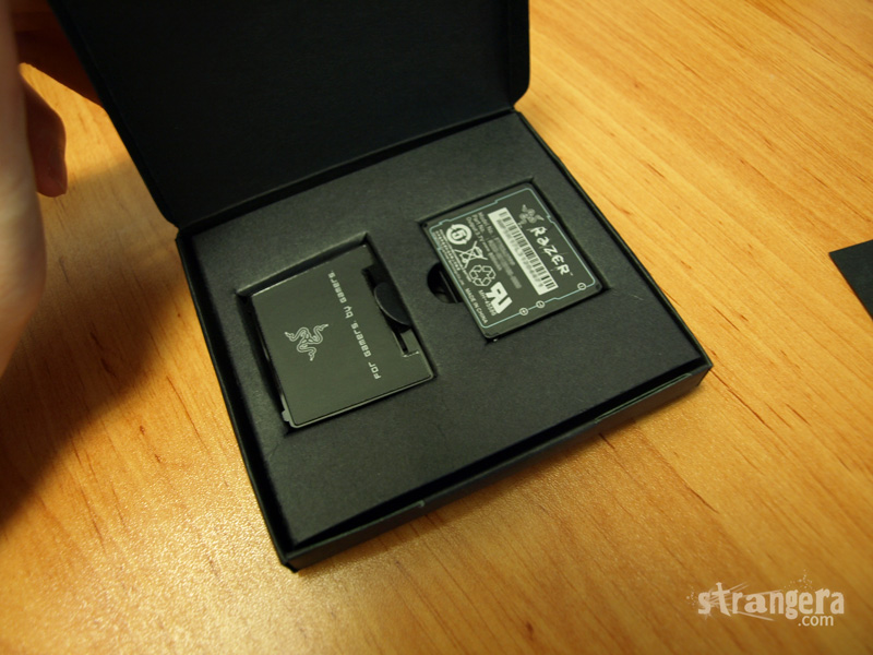 В най-горното ще намерите USB кабела който служи за връзка между PC-то и док станцията, или директно за връзка между компютъра и мишката (но за това по-късно). Естествено кабела включва вече станалите стандарт за мишките на Razer позлатен накрайник, капаче и прочие екстри… Интересното в случая е че кабела не е гумен, а е направен от нещо като въже което не само изглежда, но е и здраво и масивно 😉 Предполагам, в краен случай при оспорвана LAN битка може да бъде използван и за душене на противника, но това не сте го прочели при мен 😀