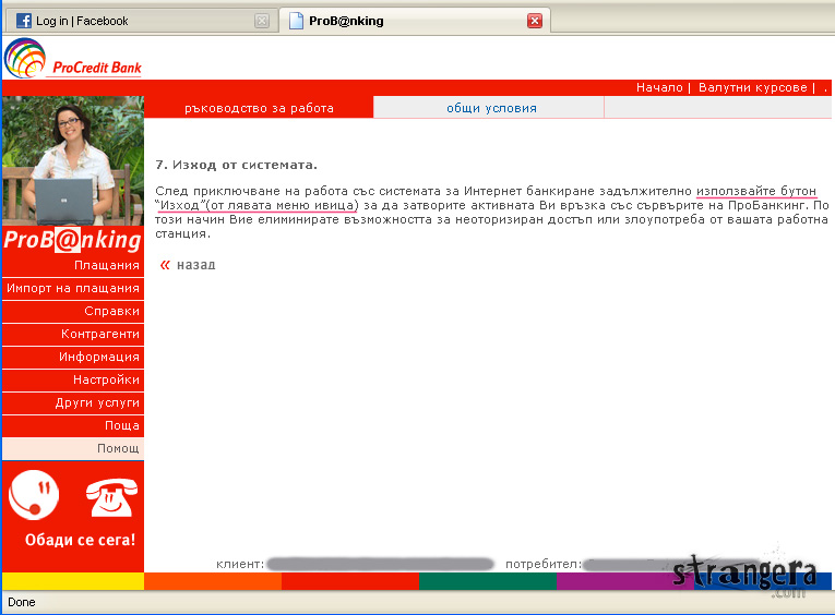 След приключване на работа със системата за Интернет банкиране задължително използвайте бутона „Изход“ (от лявата меню ивица) за да затворите активната Ви връзка със сървърите на ПроБанкинг.