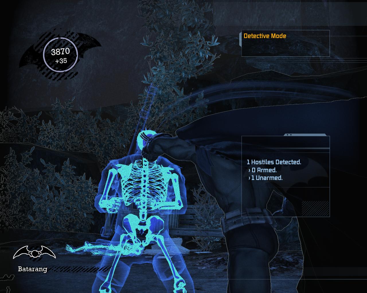 В голяма помощ тук идва и тъй нареченият Detective Mode при който прилепа пуска някакъв специален ултра тарикатски режим които засича де що има лошковци в района. Невъоръжените биват отчетени като сини, а въоръжените в червено.