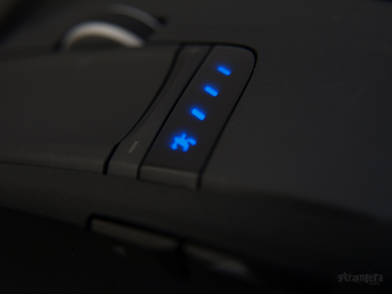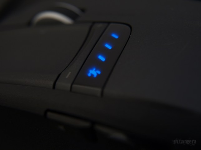 Бутоните за вдигане и сваляне на сензитивитито на мишока се намират в края на левият клик, непосредствено преди LED екранчето. Копчетата са добре разположени, и наистина няма опасност да ги натиснете инцидентно, но от друга страна са сравнително лесни за достъп. Дисплея зад тях показва на коя сензитивити степен сте, като особено готин момент е факта, че от софтуеъра на мишока можете да променяте цвета в които да светят индикаторчетата. В този ред на мисли, отдоло на мишока ще намерите бутон „profile“ които ще ви помогне да сменяте предварително зададените профили на мишока без да влизате в софтуеъра (разбира се преди това ще трябва да си ги настойте от него де). Това в комбинация с факта, че всеки профил може да свети в различен цвят, прави мишока доста удобен за ползване „on the go“ без нуждата от допълнителен софт. Btw всеки един от профилите освен да бъде сменян ръчно от бутона може да бъде настроен да се пуска автоматично при стартиране на дадено приложение 😉