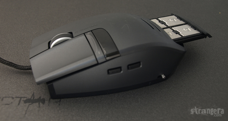 Интересен е и момента, че благодарение на „държачката“ ще можете да определите къде точно да е центъра на тежестта на мишката. Ако например сложите 2×7 в предната част на държача, а оставите другите отделения празни, реално те ще застанат точно по средата на мишока. Ако ги сложите на задните дупки обаче, центъра на тежестта ще се измести в задният край, което определено разкрива интересни възможности, и допринася за истинското персонализиране на усещането при работа с мишока.