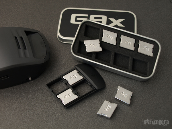 В самата мишка, има специално отделение в което да закачите до 4 тежести. Самите тежести пък идват в ултра гъзарска кутийка и са общо 8 броя – 4×7гр и 4×4гр. Тоест максималното количество „желязо“ което можете да добавите към Logitech G9x е 28 грама, което може да не ви звучи много сега но определено прави мишката, подходяща за мини тренировки в офиса 😉
