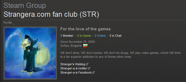 Напоследък (покрай MW2) прекарвам все повече време „циклейки“ в Steam и от време на време се джойнвам в разни изтрещили групи (Public Urinators Recon човече). Та седя си аз и си мисля (пък понякога само си седя) какво ще стане ако избера емблематичната дата 25 ноември, за създаването на групата „Strangera.com fan club“ в Steam 😀