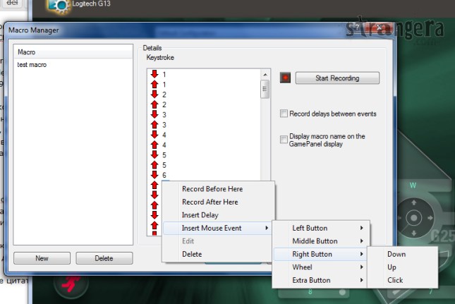 При G13 можете да записвате стандартни комбинации от копчета, като имате възможност да отбележите дали програмата да помни или не забавянето между отделните бутони. Също можете да добавяте и различни неща като клик с мишката, скролване и т.н.