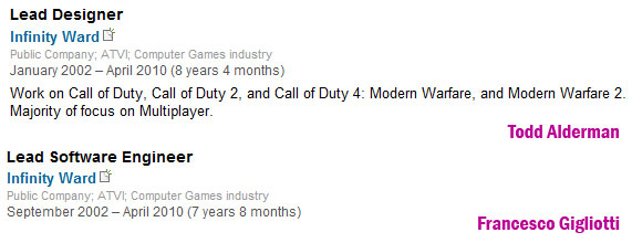 Според профилите им в Linkedin, Todd Alderman старши дизайнер на IW и един от основните хора въвлечени в разработката на мултито на Modern Warfare и историята на MW2 e напуснал компанията. Същото се отнася и за Francesco Gigliotti, старшият софтуерен инженер на IW! И двамата са известни като „стари пушки“ в екипа – Alderman e „служил“ 8 години, а Gigliotti – 7!