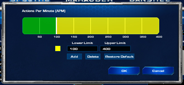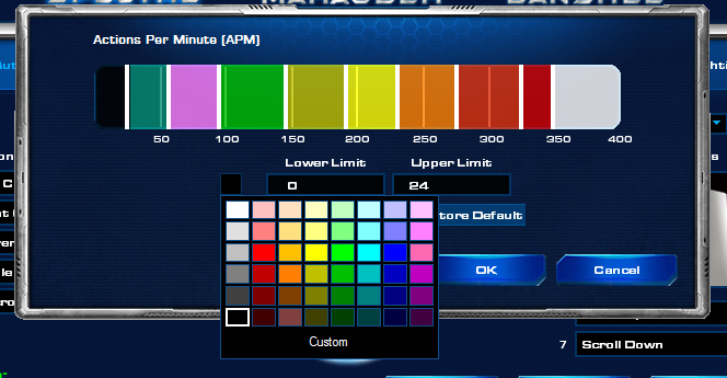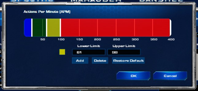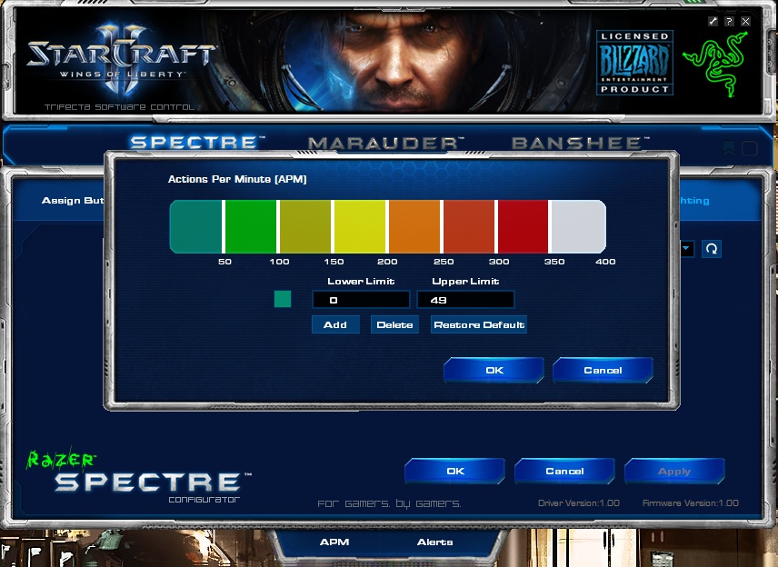 Освен чисто естетичната стойност, обаче всяка една от „играчките“ е вързана с тъй наречената APM-Lighting System. В общи линии софтуера на Razer взима вашия APM \Action per Minute, т.е. колко действия – кликове и натискане на клавишите от клавиатурата правите в минута докато играете\ и го „аутпутва“ към периферията. APM не трябва да се бърка с термина – Аре Да правиме Марини, което е съвсем друго нещо. 🙂 По подразбиране, настройката изглежда така (клик), но както знаете APM-а е различен при всеки играч, и докато горни граници от типа на 300-350 са ок, за някои про-геймъри, един средностатистически играч, трудно ще достигне такива висини (начинаещите играят със среден APM, от типа на 40-60, а средностатистическите играчи с около 100-150). Точно за това, софта позволява персонално конфигуриране на всяка едно от степените (освен това, може да избирате различен цвят за всяка една). Аз лично, понеже исках да не прекалявам с цветовете, съм си настроил нещата така:
