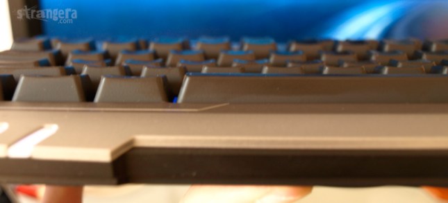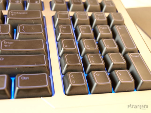 Благодарение на това, клавиатурата е доста по-компактна и място-спестяваща. Превключването между NumPad-а и другите копчета става посредством едно бутонче до F-овете, като нещото изисква малко свикване, заради частично разместените бутони, но след като се привикне на мен лично липсата на целия междинен панел не ми прави впечатление и не ми се отразява на гейминга. Е, при ползване на фотошоп, където съм свикнал да цъкам на Num-пада беше малко греда, но това е клавиатура за StarCraft, не да си я сложите в офиса. 😉