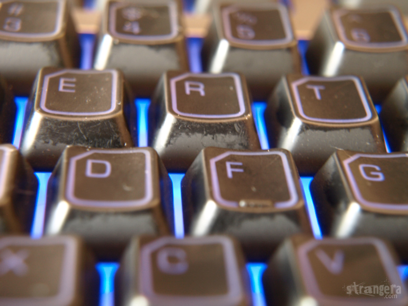 Освен самите бутони, които са лазерно гравирани и светят, целият панел под тях свети (подобно на панела на Razer Nostromo). Както казах гумените бутони са супер приятни и доста безшумни, между другото. Единственият им проблем е, че по тях се трупа странен тип мръсотия: