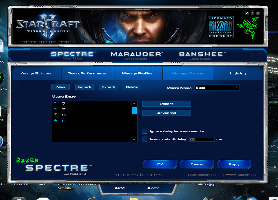 Magane Macros – тук може да си генерирате макрота, които после да си закачате по бутоните в Assign Buttons. Освен всички копчета на мишката и клавиатурата, макротата може да включват и по комплицирани неща като copy, paste, приспиване на компютъра, отваряне на експлоръра и т.н. Аз например съм си направил едно доста просто, но ефективно макро, което на галено наричам „Base“. Въпросното изглежда така: 7->S и е мапнат на единият страничен бутон на мишката. Обяснявам – тъй като играя алчен Теран, при начало на всеки мач винаги си мапвам команд центъра с ctrl+7, и по този начин всеки път, когато натисна въпросното копче, на което съм мапнал base макрото…. в базата ми започва производство на SCV \мухахах. Другият ми страничен бутон е ремапнат на 7, за да имам бърз достъп до команд центъра и пускане на скан и мулета. 😉