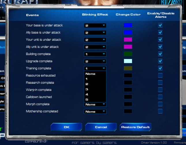 Повече отношение към играта има тъй нареченият Alerts фийчър. Това е опция периферията ви да „излъчва“ специални светлини сигнали при настъпване на дадено събитие в играта (нападат ви, мадършипа ви е готов и т.н.). По времето на писане на този материал (Driver v1.00), в софта има налични общо 13 „явления“, които могат да активират въпросната светлинна индикация. Всяко едно „явление“ може да кара периферията да присветва до 5 пъти в зададен от вас цвят.
