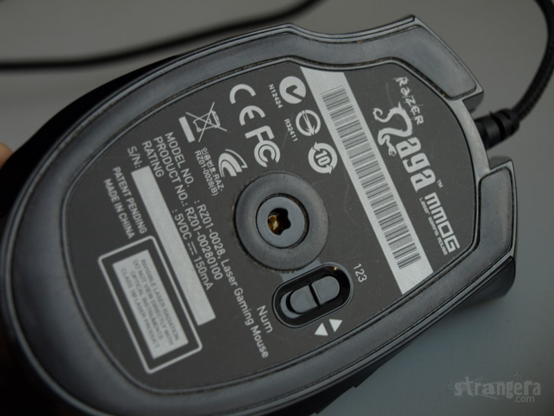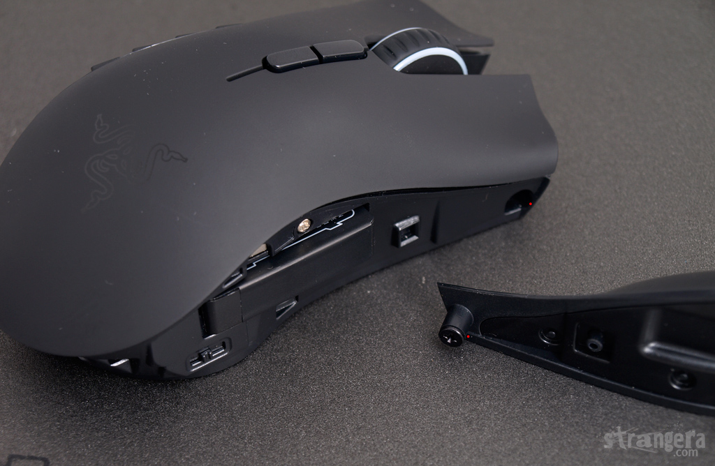 Имаме си on/off бутон, с който определяте дали страничният панел да е num пад или цифри от 1-12 и копче за „свързване с док станцията“. Копчето, което трябваше да се натисне, за да се откачи кабела от Razer Mamba \клик\ е премахнато и кабела тук се вади само с издърпване.
