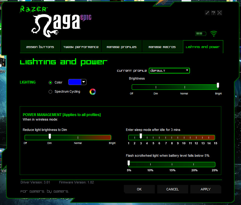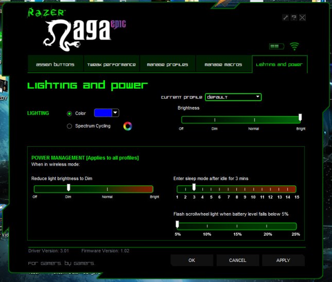 Може би някои от вас ще бъдат разочарование от факта, че светещите неща по мишката са само скрола и страничния панел, а логото под дланта вече не свети, но няма пълно щастие…, а и със сигурност е имало някои енергоспестяващи фактори, които са били взети предвид, когато е направено това решение. 😀 Освен избор на цветове, можете да настройвате и силата на светене, като вариантите са съответно Dim; Normal и Bright. Хубавото е, че има отделни плазгачи за силата при включен кабел и безжичен режим. 😉