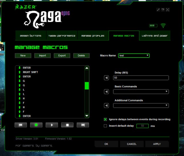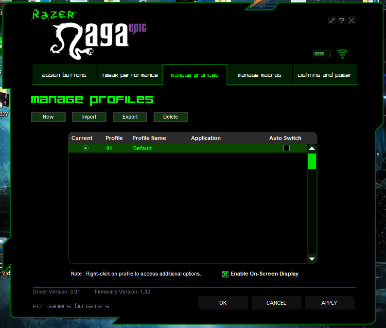 За съжаление, точно както оригиналната Naga, и Naga EPIC няма „Synapse onboard memory“, което ще рече, че всички настройки, които правите по мишката се запазват локално на компютъра ви, а не в мишока. Което принципно не е проблем, но означава, че ако включите мишката си към друга машина, ще трябва да си дръпнете софтуера и направите настройките отново. Поне има опция за импорт/eкспорт на настройките, което е удобно.