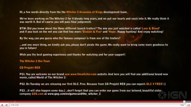 Също така (понеже DLC-то се споменава в скритото послание), вчера CD Projekt RED обявиха, че всички бъдеща DLC-та за The Witcher 2: Assassins of Kings ще бъдат безплатни. Първото DLC \сайд куест наречен „Troll Trouble“\ ще излезе във вторник заедно с играта. Освен това CD казват, че ако ще искат пари за допълнително съдържание, то ще бъде за експанжън пакове, а не за DLC. Тук разяснявам, че миналата седмица компанията заяви че обмислят пускането на експанжъни за играта, което стопли сърцето ми. 🙂