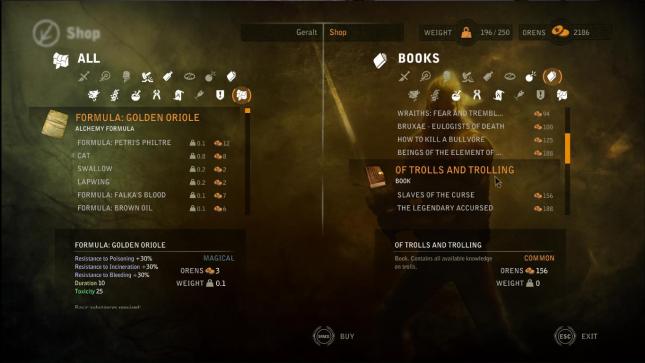 Един от ключовите елементи в инвентара на Вещера са „поушъните“. В митологията на Сапковски, вещерите пият различни отвари създадени от билки и прочие гадости, преди битка. Аз като човек играл първата игра (и чел част от книгите) съм напълно наясно с това, но говорейки с приятели не запознати с митологията стигнах до извода, че доста въобще не са разбрали за това, така че обяснявам. Тук за разлика от масата игри, тук не си мапвате поушънките на разни слотове и не ги пиете по време на битка. Тц. Идеята е внимателно да се подготвяте за дадена битка, и съответно преди да влезете в нея да изпиете съответните поушъни според ситуацията. Демек, влезете ли в битка… вече е късно за поушън. Това е логично, и вярно на митологията но със сигурност ще спре много хора от това да използват отвари. 😦