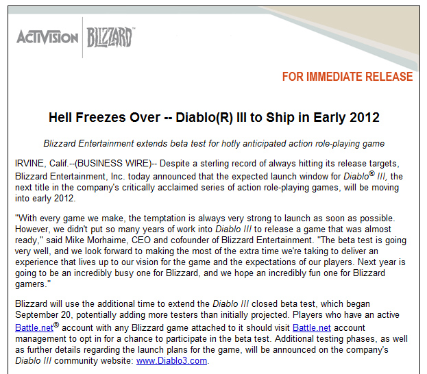 Между другото особено култово, е че прес релийза казва, че въпреки че до сега винаги са си пускали игрите навреме (!?) 😀 Blizzard Entertainment обявяват, че „прозореца за излизането“ на D3 е преместен за началото на 2012. Естествено това се правило с цел да се събере повече инфо от бетата и т.н.