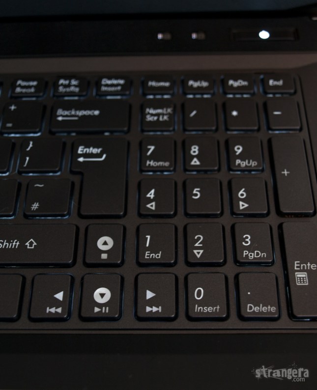 Като стана въпрос за клавиатурата, G53 серията е оборудвана и с num pad, като за да се спести място, 0-та на нумпада (която принципно е два бутона) е превърната в един, а свободното място е използвано за дясна стрелка. Традиционните копчета, които се намират между клавиатурата и нумпада пък, са качени над нумпад и бекспейс, като двата клъстера са „сгъчкани“ един в друг и даже е останало място за голям enter, което винаги е далаверка. 😉