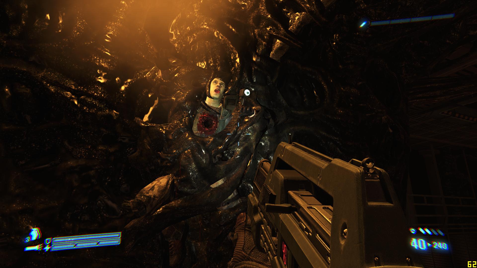 Няма я Alien атмосферата, няма го чувството на обреченост, няма го ужаса. Благодарение на лошо скриптиране и кофти дизайн решения, играта фейлва дори в това да ви изплаши с „БУ моменти“ (завивате зад ъгала и някой казва БУУУУУУУ). В началото например (още преди първата среща с елиеъните) играча бива запознат с хора накачени по стените и използвани за „излюпването“ на слузести гадинки.