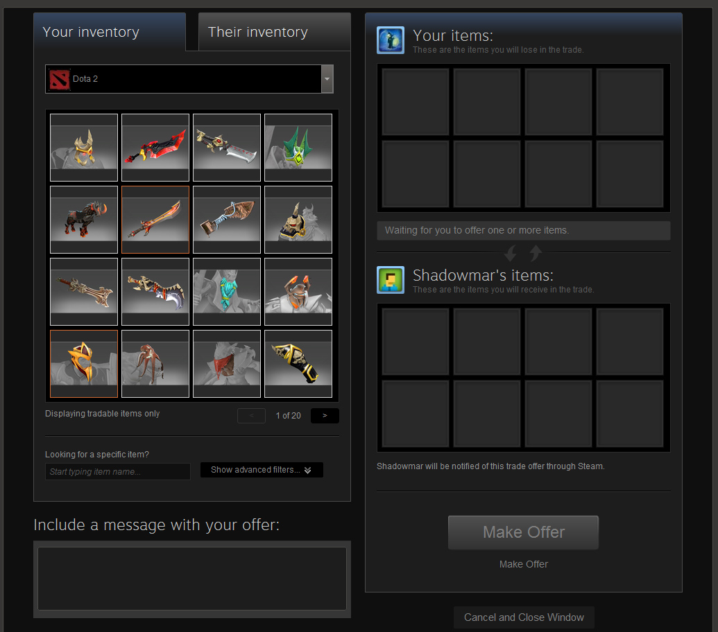 След като изберете New trade offer, трябва да посочите приятеля с който смятате да правите схеми и след това ще видите трейд-о подобен интерфейс в който избирате какво давате вие, какво искате от човека и евентуално оставяте коментар.