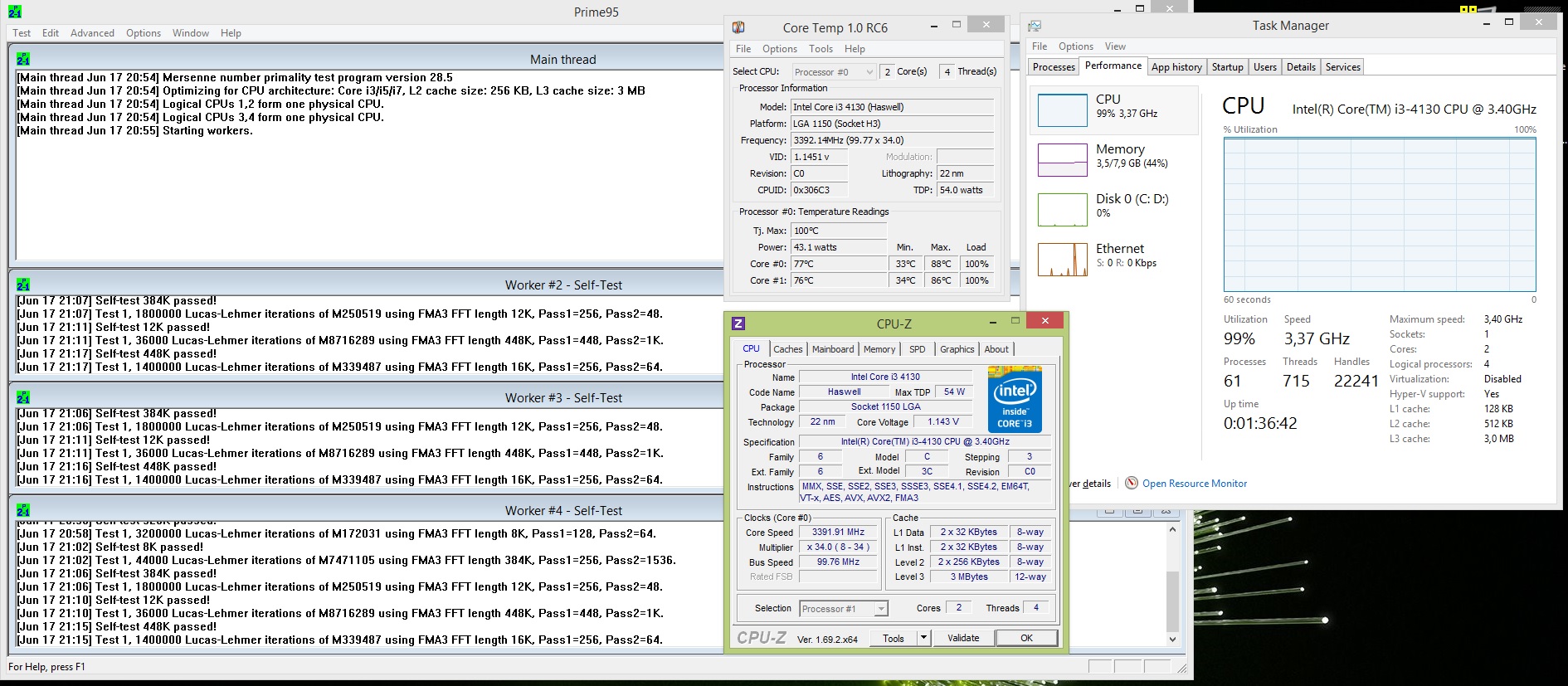 Конфигурацията идва с два 120mm вентилатора – един на задния панел изкарващ въздуха навън, и един на долния панел. Това, плюс вентилаторите на видеото, процесора и захранването създават доста приятен въздушен поток в кутията. Като казах въздушен поток, ето резултатите след около 30-тина минути „мъчения“ с Small FFT’s теста на Prime95: