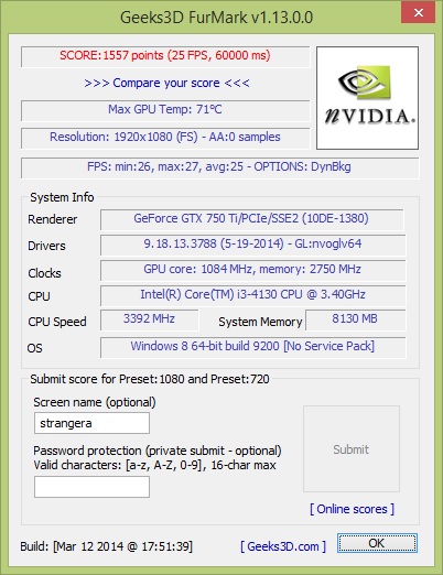 При видеото, максимума които успях да достигна беше 71 градуса – 15 минути burn-in 1080p benchmark-a (2354 points) и след това регулярни 1080p bench на FurMark v1.13.0.0.