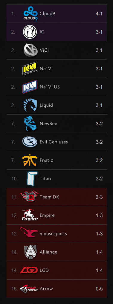 Другата голяма изненада е крайно не убедителното представяне на Alliance който са на предпоследна позиция с 4 загуби (от iG, Titan, NewBee и DK) и една единствена победа срещу Arrow. Въобще или днес Alliance ще трябва да влязат в GOD MODE, или може скоро да трябва да хващат самолета към дома… В този ред на мисли, DK също са доста назад с 2 победи и 3 загуби.