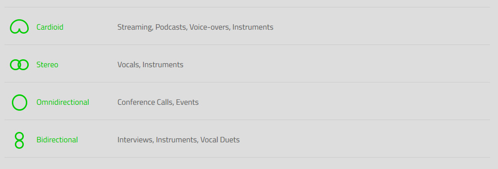 • Polar patterns: Cardioid, stereo, omnidirectional, bidirectional