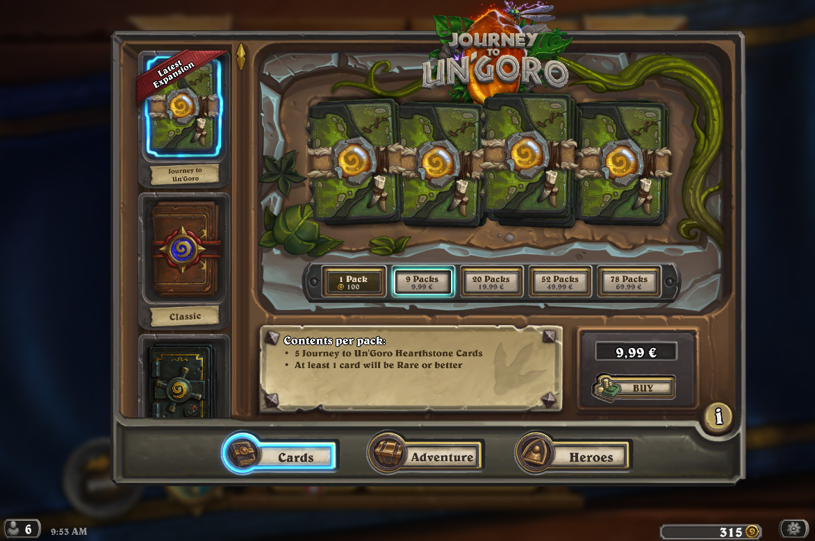 Blizzard пуснаха „лятно“ Hearthstone Journey to Un’Goro промо a.k.a. купувате си Un’Goro пакове (с истински пари) и получавате бонус пакове. Съответно на цената на 7 пака получавате 9, на цената на 15 – 20 и т.н.