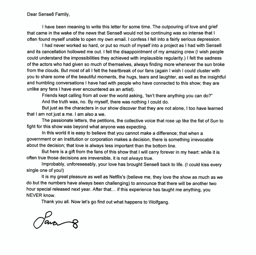 Признавам си, че бях доста разочарован когато Netflix обявиха, че спират сериала Sense8, като основния ми проблем не беше свързан с факта, че са решили да спрат шоуто, а с това, че историята увисна във въздуха. Нещо което лесно можеше да се разреши с един финален епизод. Уви, официалното становище което дойде около седмица след анонса беше – сори, ма няма какво да се направи.
