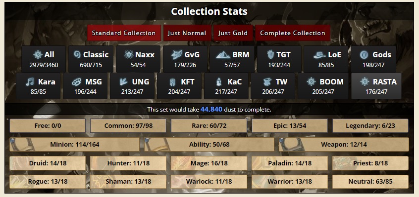 Относно дъста – 170 common, 23 rare и 1 epic повтарящи се карти генериращи 1410 дъст + още 100 от екстра картите (4 common и 4 rare).