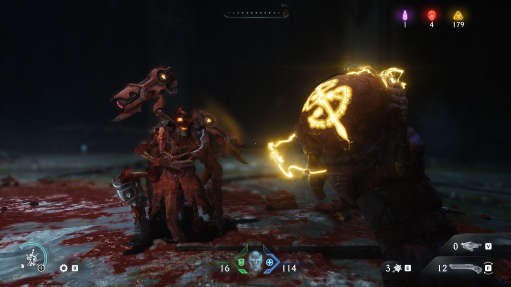 Оръжията също са много забавни — харесвам “Dark Ages” трактовката на добре познатия арсенал. Оръжие, което смазва черепи и изстрелва натрошените кости като шрапнели, е топ. Признавам си, че фаворизирах combat shotgun-a просто защото е супер фън, и защото винаги ми е било любимо Doom оръжие, но и останалите не са лоши. Ъпгрейт системата е семпла, но дава достатъчно разнообрази, така че да има смисъл от нея.