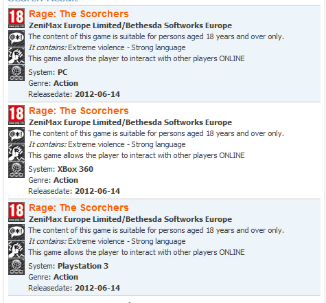 Интересно. Наскоро PEGI (да не се бърка с Пеги от Женени С Деца) са дали рейтинг 18 (клик) на нещо носещо името Rage: The Scorchers и издавано от ZeniMax/Bethesda Softworks.