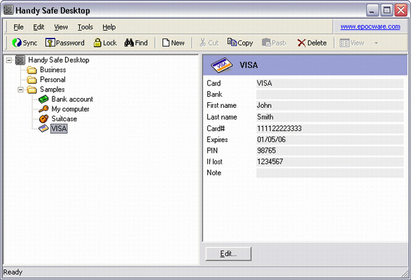 За да е пълен комплекта имаме и Epocware Handy Safe Desktop v5.09 което е PC версията на въпросната програмка. Разбира се поддържа синхронизация с телефона, и безспорно с него ще ви е по-лесно и бързо да едитвате и добавяте данни. Както и мобилната версия, Safe Desktop иска парола при стартиране и т.н 😉