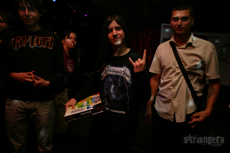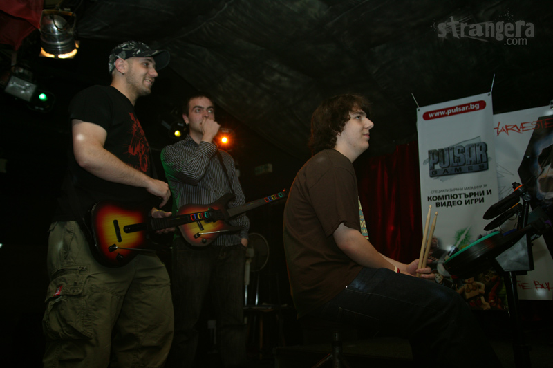 Събитието беше обявено за 21:00, така че ударната ни група се изтъпанчи в Бекстейдж към ту 20:00 с цел заемане на стратегически позиции. Тъй като с компанията знаехме, че ще има и турнирче по Guitar Hero: Metallica бяхме решили да включим двамата ни най изтъкнати играчи – kainy и Malek. Както се вижда и на снимката по-долу, бях се постарал и двамата да са добре брандирани 😀