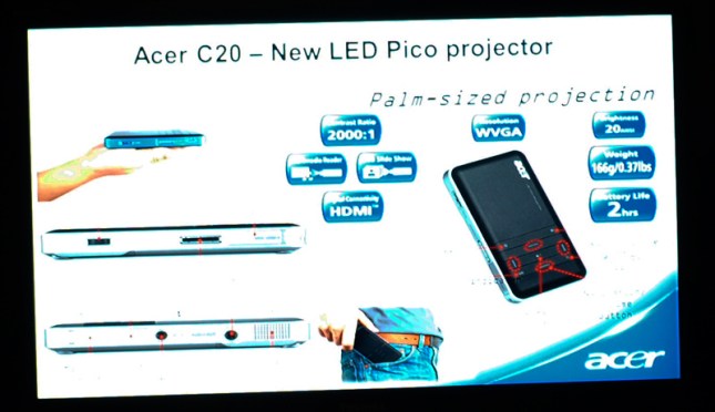 Видяхме и новата серия проектори, като има един особено култов който от 13 см разстояние прожектира на 77инчов диагонал, но лично аз най-много си харесах Acer C20 – портативно LED проекторче с повече от симпатични показатели.
