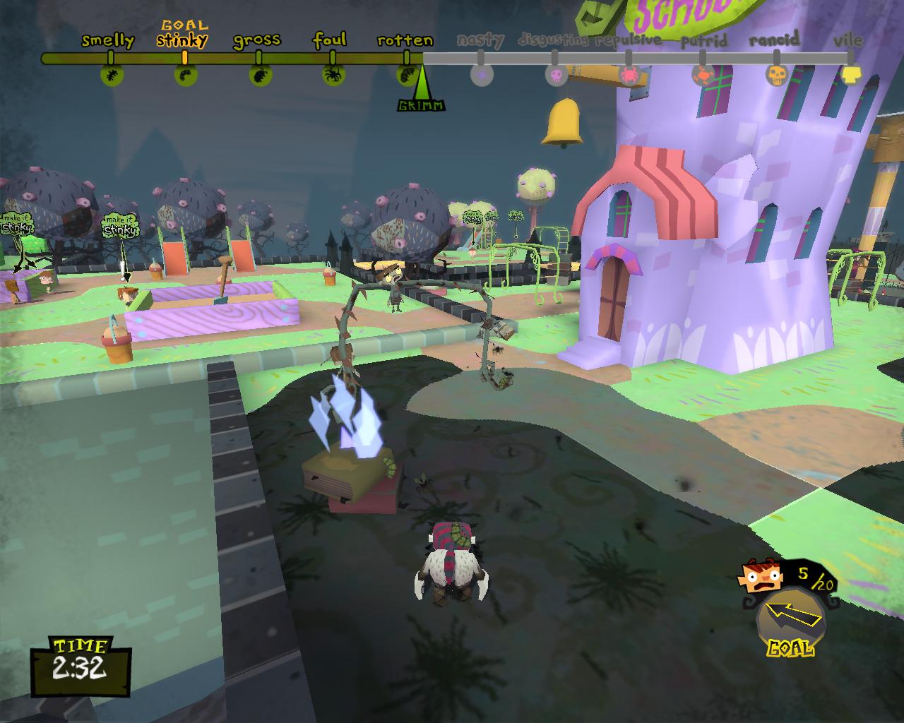 Управлението и начина на игра са ужасно прости. Можете да се движите като използвате единствено мишката или чрез стандартната WASD конфигурация и мишката. Също така можете да подскачате, а ако застанете на едно място Грим започва да пишка и при натискане на скок, ще се озовете на мястото на което пишкате. 🙂 Има леки джъмп енд рън елементи на места, но нищо сложно… особено при номера с пишкането.