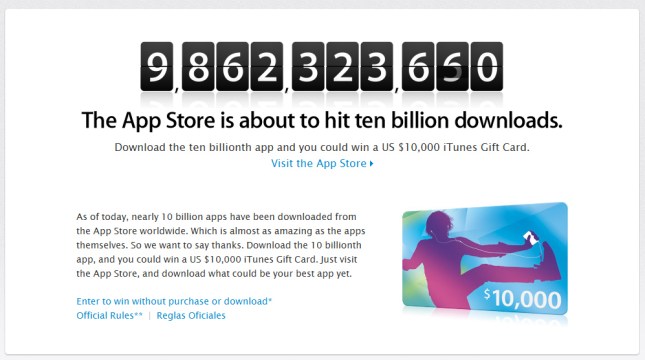 Но, вместо да се впускаме в алабалистики, нека да се съсредоточим върху 10,000,000,000 свалени апликации. По времето на писане на тази статия, броя на свалените приложения от апп стора е около 9 862 400 000, а най-забавното е, че този който направи далнлоуд номер 10,000,000,000 ще получи скромният подарък от $10 000 под формата на iTunes Gift Card… Което означава, че ще може да си сваля апове „без пари“ през следващите 100-тина години. 😀