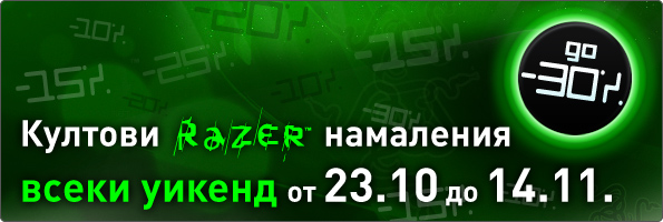 Култови Razer намаления в Ozone.bg – всеки уикенд от 23.10 до 14.11 – през следващите 4 уикенда, Ozone.bg и Razer ще пускат определени продукти на специални промоционална цена, така че ако смятате да пазарувате пред-празнично, ослушвайте се 😉 Освен това, ако успеет да отгатнете кой ще са продуктите, имате шанс да спечелите Razer Sphex Serious Gaming Edition. 😉