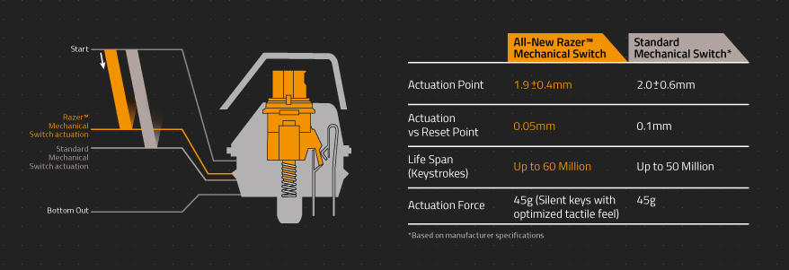Както виждате бутоните отново изискват 50g сила на натиск, но натискането се отчита на 1.9 мм спрямо стандартните 2.2. Освен това Razer твърдят, че новите им суичове могат да издържат до 60 милиона натискания, срещу 20 милиона при стандартните бутони. Разбира се копчетата ще продължават да издават така любимия ми тракащ звук при натискане.