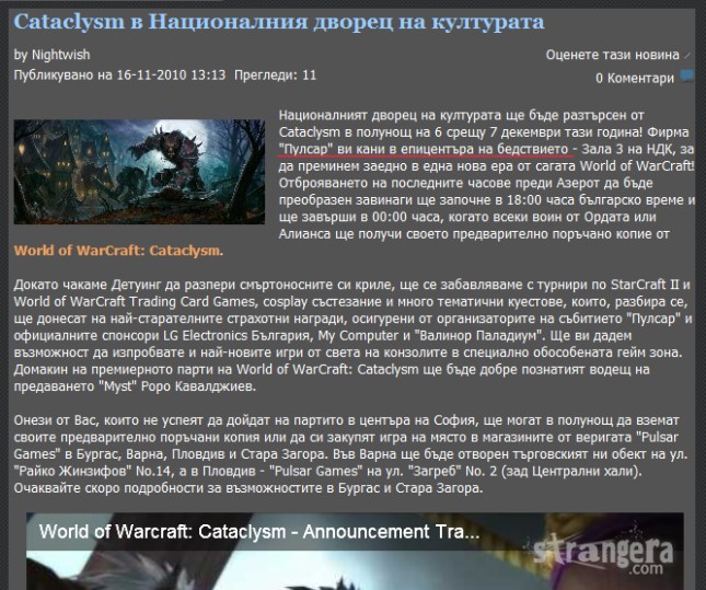 Понеже този път никой не ми го прати официално, аз си го намерих сам и тъй като вече цяла сутрин не мога да се съвзема от смях, и понеже последният път като публикувах лично мнение за парти на Пулсар посещенията в блога ми нараснаха главоломно благодарение на хилядите разгневени техни фенове (т’ва е шега между другото) реших да ви насоча към епицентъра на бедстващите копирайтъри, и поканата на Пулсар за тяхното „пусково парти“ за World of WarCraft: Cataclysm.
